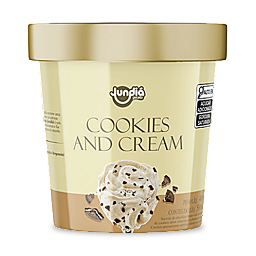 Combinação de chocolate branco com recheio cremoso de leite e pedaços de biscoito.